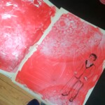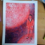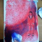 und ließ mich in die Welt der Mischtechnik einweisen. Das kann ich nur empfehlen und ist genau mein Ding. Erst mit Spachtel oder dickem Pinsel Farbe aufs Papier, dann mit Schablone Muster sprühen und erst dann langsam überlegen, was denn sonst noch so auf das Bild könnte. Es wird also quasi ein Bild aus dem Bild gekitzelt. Der eine Hintergrund eignete sich einfach richtig gut, um eine Figur rein zu zeichnen und irgendwie erinnert sie jetzt an den kleinen Prinzen auf seiner Reise… und in dem anderen war ganz vage ein Gesicht zu erkennen, das nur noch heraus modelliert werden musste. Beide Zeichnungen sind mit Pastellkreiden und Aquarellstiften ausgearbeitet. Das schreit nach Wiederholung!